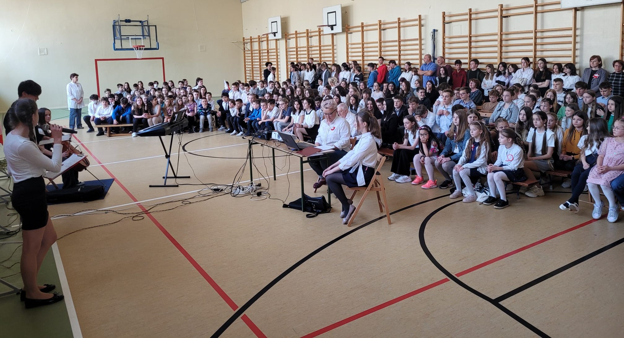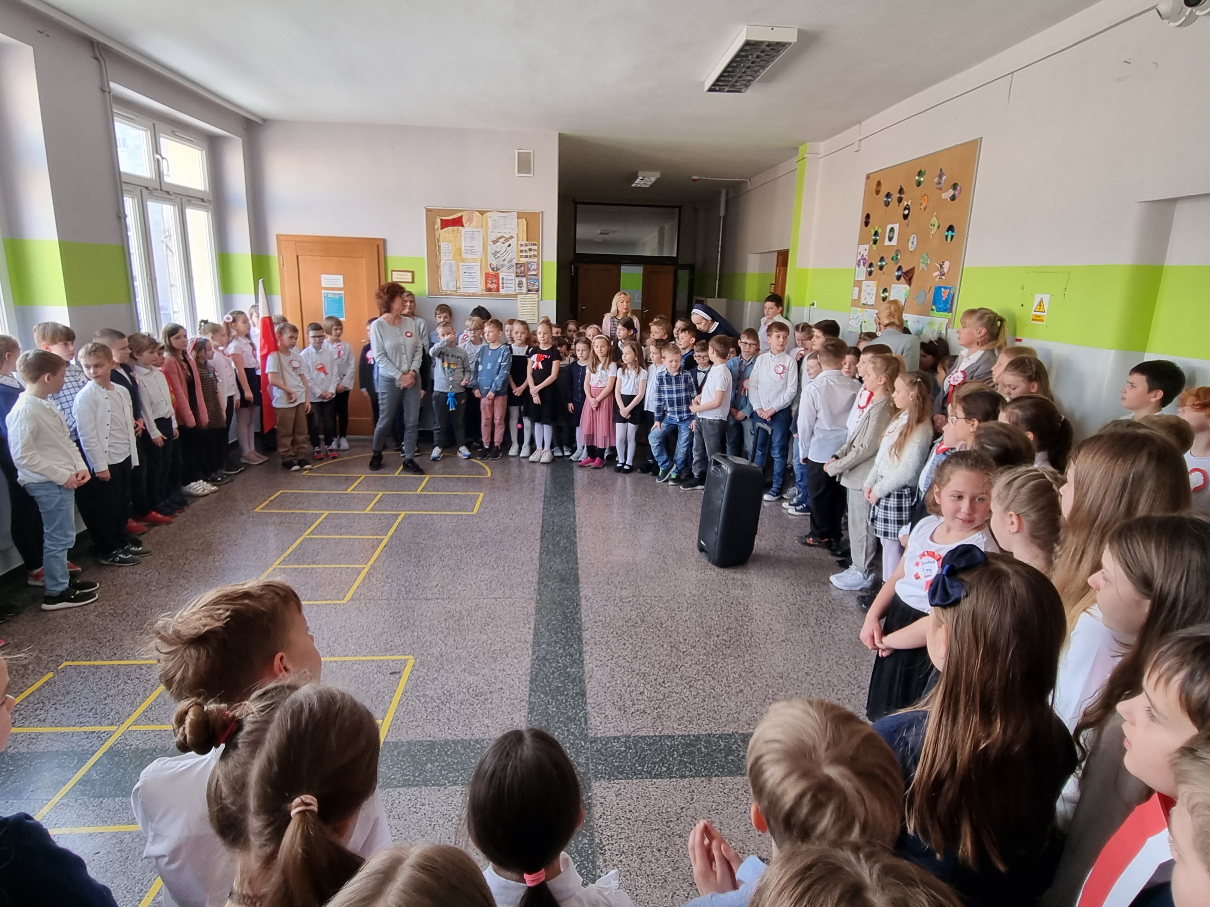Odświętnie ubrana, z kotylinami przypiętymi do koszul i sukienek, nasza młodzież, po uroczystym odśpiewaniu hymnu, wysłuchała informacji przypominających najważniejsze wydarzenia historyczne. Całości dopełniały występy naszych chórzystów, którzy wykonali kilka utworów o charakterze patriotycznym, a także mogliśmy wysłuchać pięknej i świetnie grającej wiolonczelistki. Najlepsze jednak zostało na koniec, ponieważ nasi uczniowie, którzy długo nie dali się prosić, wspólnie odśpiewali piosenkę - "Jesteśmy Polką i Polakiem".