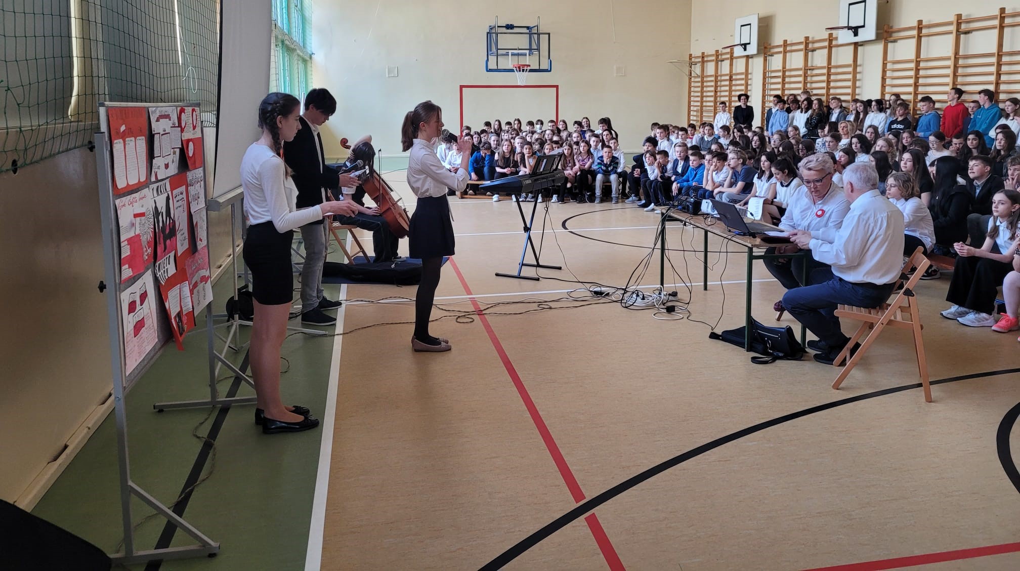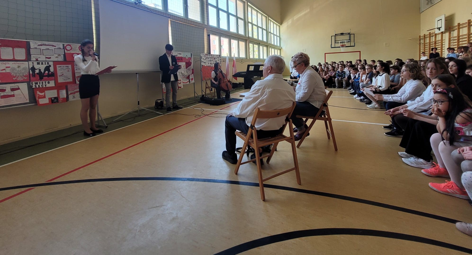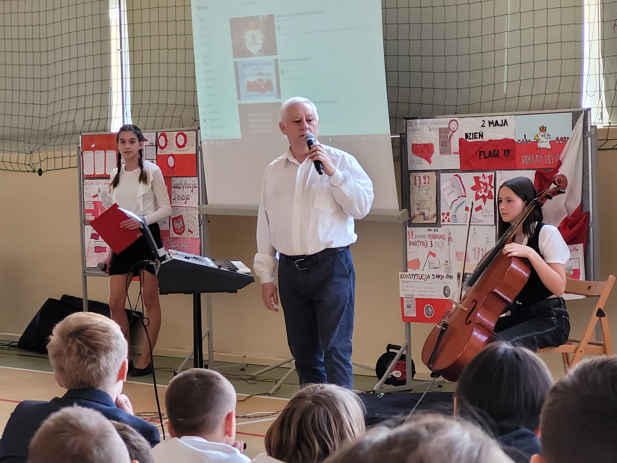 Z kolei uczniowie klas starszych IV - VIII spotkali się w sali gimanstycznej o 11.30. Dla upamiętnienia rocznicy uchwalenia Konstytucji 3 Maja czy Dnia Flagi Rzeczypospolitej Polskiej uczniowie klasy 7d - Marta Kozakiewicza, Lena Bielesza i Patryk Kukurowski oraz nasz szkolny chór, a także wiolonczelistka - Antonina Borek pod czujnym okiem, a raczej oczami, p. Elżbiety Bartoszek oraz p. Marka Pobierowskiego przygotowali apel, który ostatecznie, dzięki spontaniczności naszych uczniów, przekształcił się w narodowy happening...