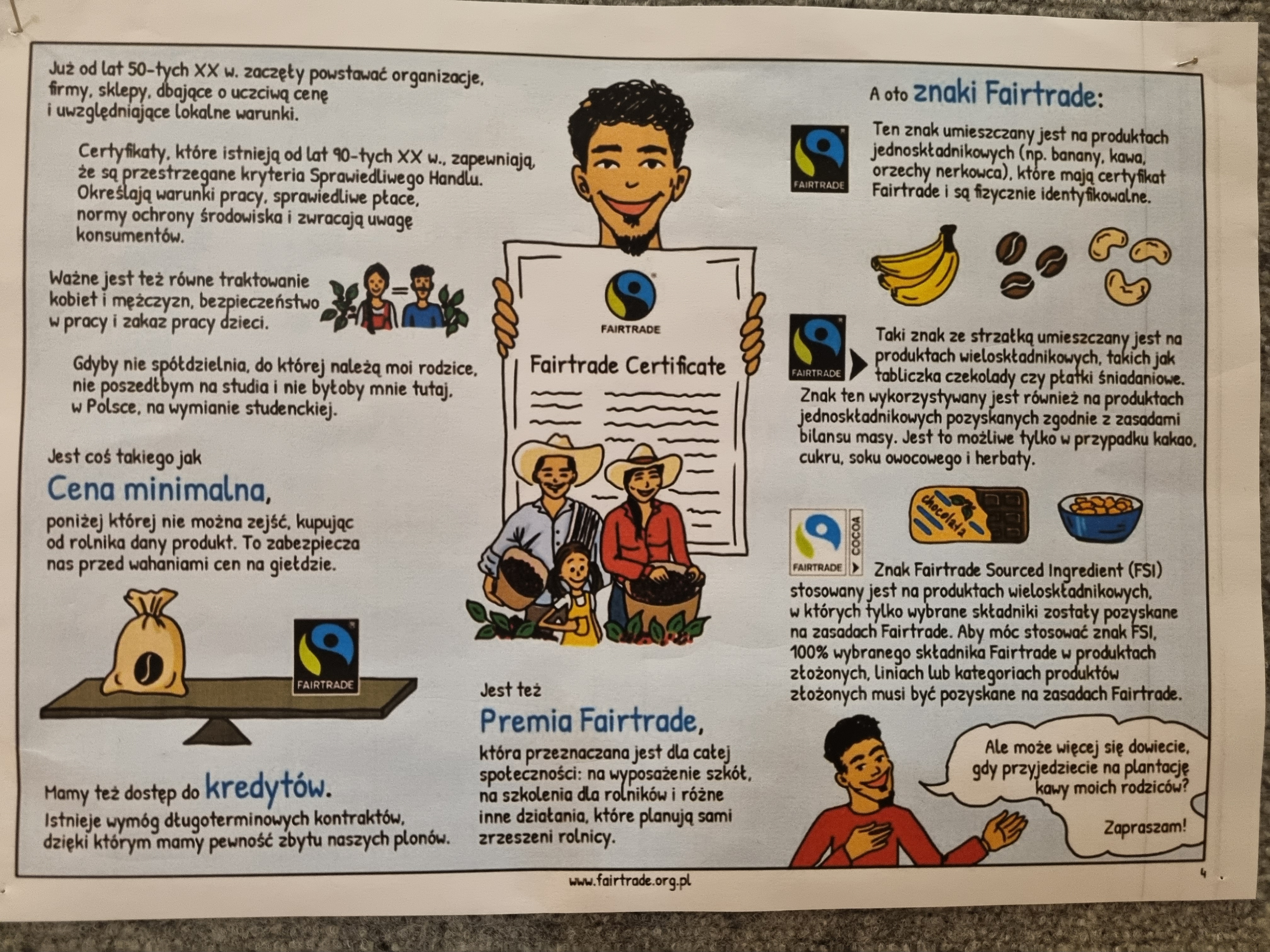 W związku z powyższym od 14 do 20 listopada br. została przygotowana z tej okazji wystawa, która cieszyła się dużym zainteresowaniem. Młodzież, czytając historię trojga bohaterów, mogła znaleźć odpowiedzi na kluczowe pytania i tym samym odczarować słowo - FAIRTRADE (poniżej galeria zdjęć).