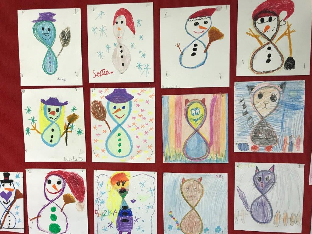 Dzieci rysowały leniwą ósemkę palcem, nogą, głową w przestrzeni, następnie uczyły się rysowania ósemki na płaszczyźnie, a potem kreśliły leniwą ósemkę wielokrotnie po śladzie. Kolejnym krokiem było przeistoczenie leniwej ósemki w różne postacie np.: kotka, bałwanka czy króliczka. To ćwiczenie sprawiało dzieciom największą frajdę. Dzieci rozwijały w ten sposób precyzję ruchów oraz koncentrację uwagi.